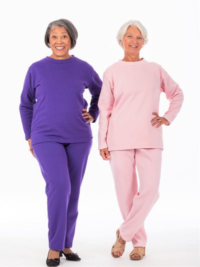 This ultra-cozy fleece sweatsuit features snaps down the back of the top and zippers down the side of the pants. A gentle elastic waist ensures a comfortable fit. Assorted Solid Colors Poly/Cotton Fleece