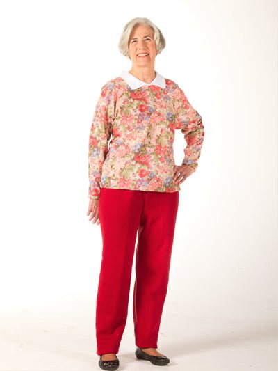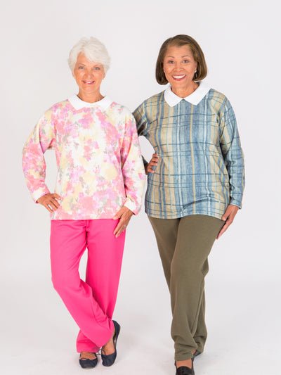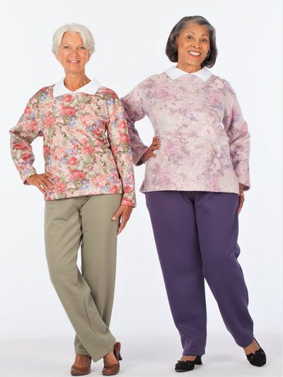 Our back-snap fashion fleece adaptive sweatsuit is a wonderful option for those who prefer the warmth of fleece but who may need assistance dressing. Gentle elastic around the waist and side zipper pants pair with a back snap top to ensure ease of dressing.