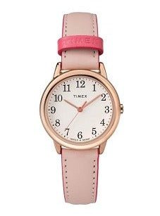 This watch features a beautifully feminine, adjustable leather light pink band and gold color bezel. It also has easy to read numbers, and indiglo night-light, and is water-resistant.