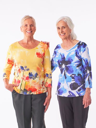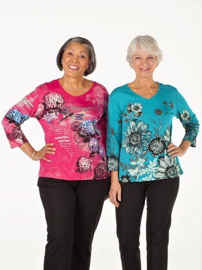 These gorgeous 3/4 sleeve tops have beautifully vibrant prints! A gentle curve and soft yet durable fabric ensures a proper fit and longevity. Assorted cotton tops and polyester blends.