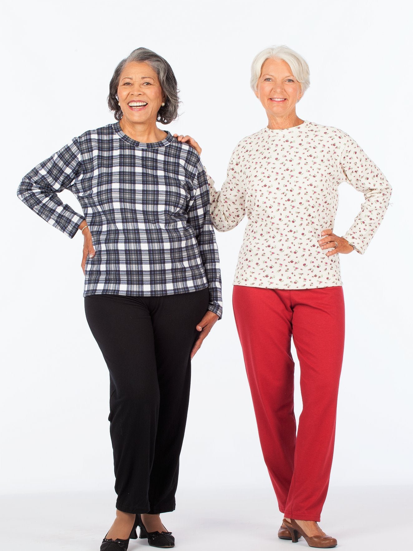 Now available in long-sleeve, this adaptive outfit features a back-snap top, side-zip pants, and an elastic waist. Assorted Prints & Colors Poly/Cotton Knit