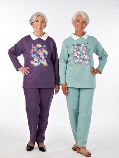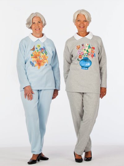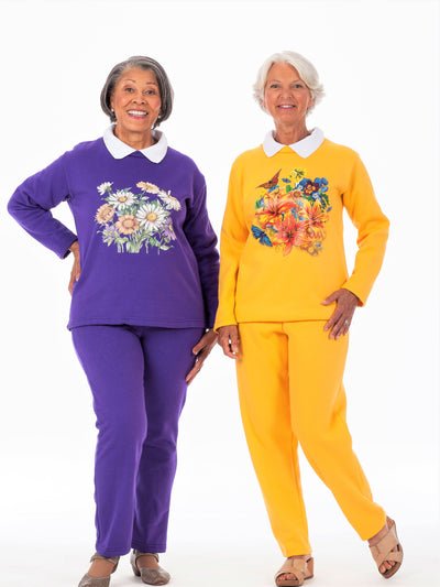 Our super-soft fleece sweatsuit is now available with a screen print and collar! Mux up your wardrobe with a few different colors and prints- you’ll want to wear these all the time!