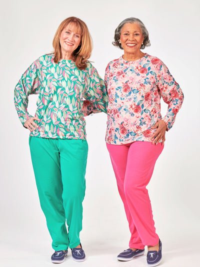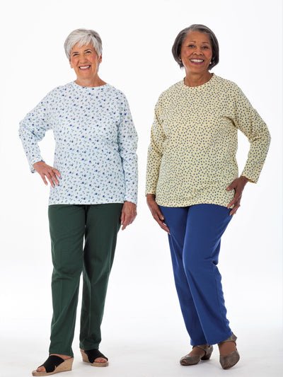 This knit set is perfect for lounging. The fabric is breathable yet durable and assorted prints coordinate with gentle elastic waist pants. It is available in sizes up to 6X!