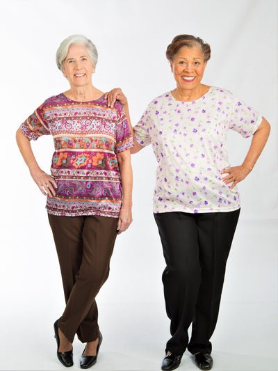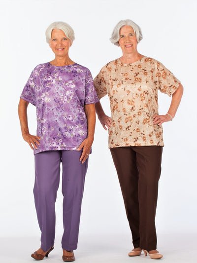 This lightweight outfit looks great for any occasion. Elastic waist gabardine slacks coordinate with a printed short sleeve top that is tough in the wash yet “silky” on the skin. It’s even wrinkle-resistant!