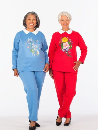 You won’t find a more comfortable adaptive fleece outfit! Easy to use back snaps and side zip pants simplify dressing and undressing. Assorted Screen Prints & Colors Poly/Cotton Fleece