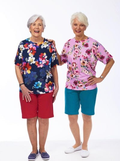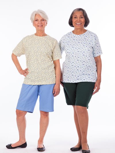Our shorts sets are ideal for warmer weather!  Elastic waist shorts reach to the knees and coordinate with assorted printed tops. Assorted Colors & Prints Poly/Cotton Knit