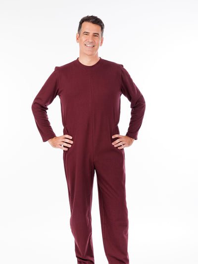 This adaptive jumpsuit is ideal for those who may disrobe day or night.  It is made from a soft, stretchy knit fabric and features a rear zipper and snap cover.