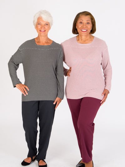 Our Square Neck Outfit is available with fun stripes to brighten up your wardrobe! The fabric is lightweight and comfortable. Enjoy it year-round.