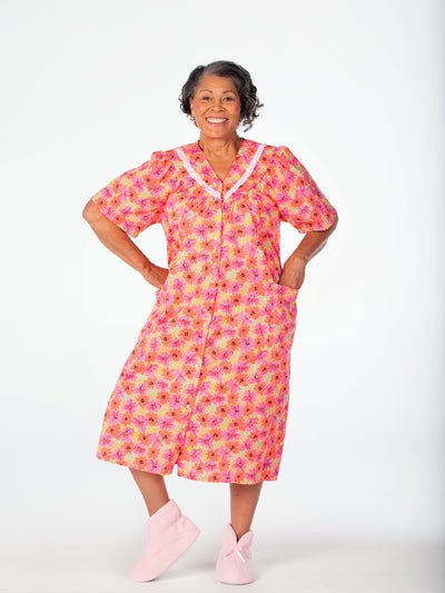 Our front-snap duster makes dressing easy! It features lace trim at the neckline, two pockets at the hip, and breathable fabric for all-day comfort.