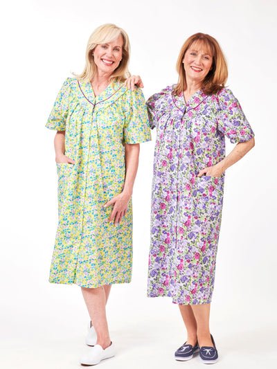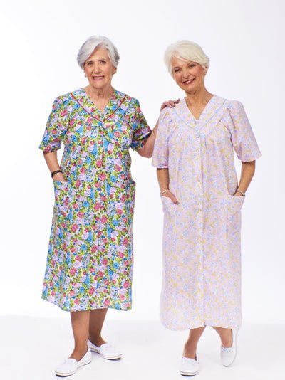 Our front-snap duster makes dressing easy! It features lace trim at the neckline, two pockets at the hip, and breathable fabric for all-day comfort. Assorted Prints & Colors Poly/Cotton Woven